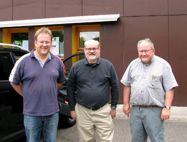 Juergen Broedel, Roger Dugan, Gerhard Broedel in front of the Broedel lumber store.