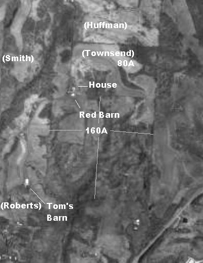 This is a USGS photo of the Offord farm North of McConnelsville on Dugan Rd. When they named the roads, they used the name of the longest resident of the road. The outlines of the fence rowas can be clearly seen. The rectangle toward the top center is the 80-acre Townsend farm that was the last on Alexander Offord acquired. You can see the barn and the house in the lower left corner of the rectangle. The barn actually sits on the 160 quarter-square to the South. To the South and West is the Roberts Farm acquired by Frank Dugan and now owned by Tom Dugan. At one time Frank also owned the 77A parcel directly west of the Townsend farm, which was acquired from the Smiths by Frank and Adda Offord. That was sold to the neighbors a few years ago.