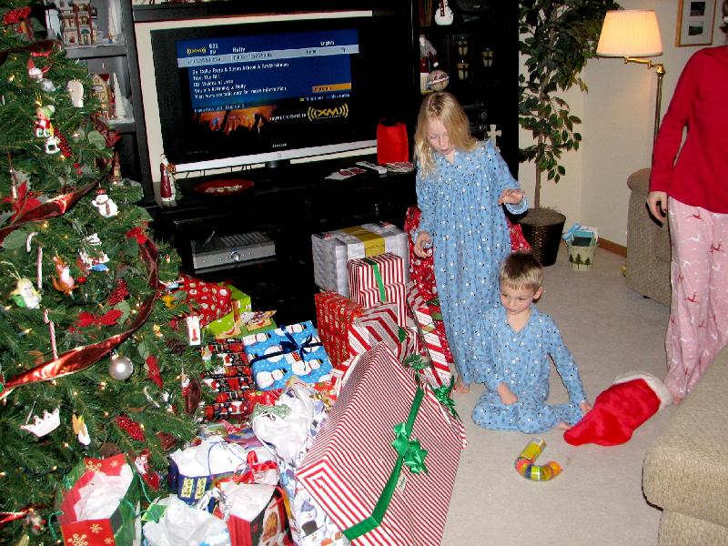 Sam and Peyton survey the presents. The ones with red striped wrapping and green ribbon came from Santa.