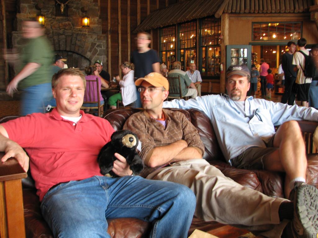 Bob (with new pet bear), John and Chris inside the lodge.