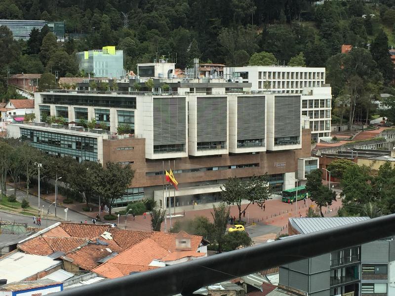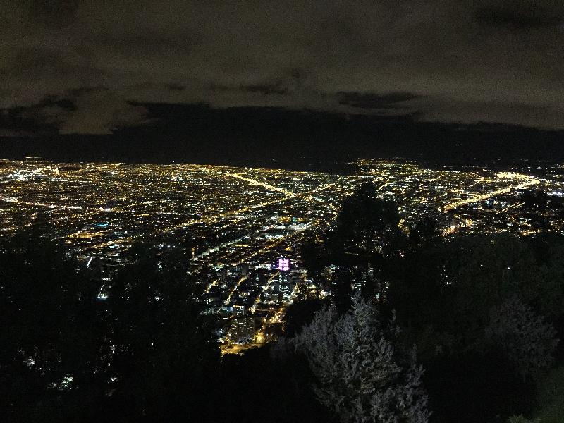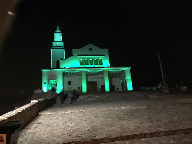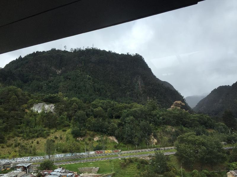 View up the mountain to Monserrate. Note cables for cable cars and track fo train to top (and tunnel).