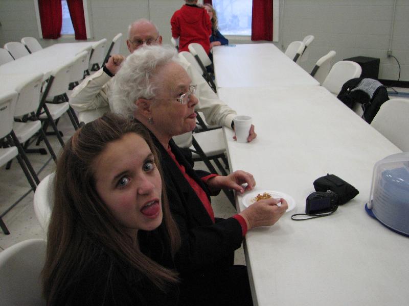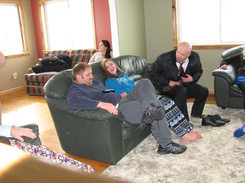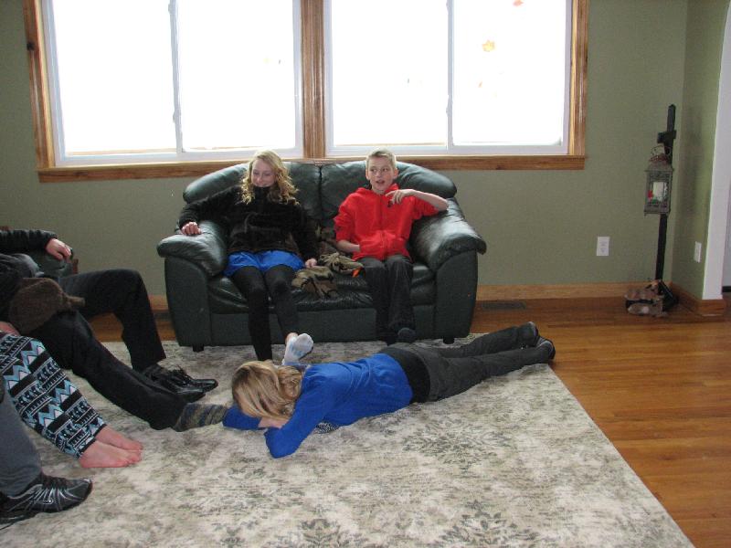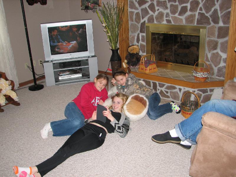 Samantha Schuman with cousins Aubrey and Anna McIntire at Betty and Dennis Thatcher's (those are Dennis' feet). There was no room in