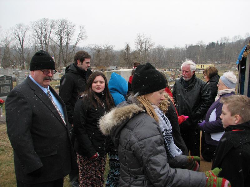Family gathered at gravesite. Weather was brutal. (l-r) Jim Kinney, ?? friend of Emily's??, Riley Kinney, Kathy Dugan Schumann, Bob Dugan