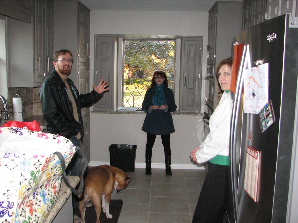 In the kitchen: Greg, Meredith, and Peggy