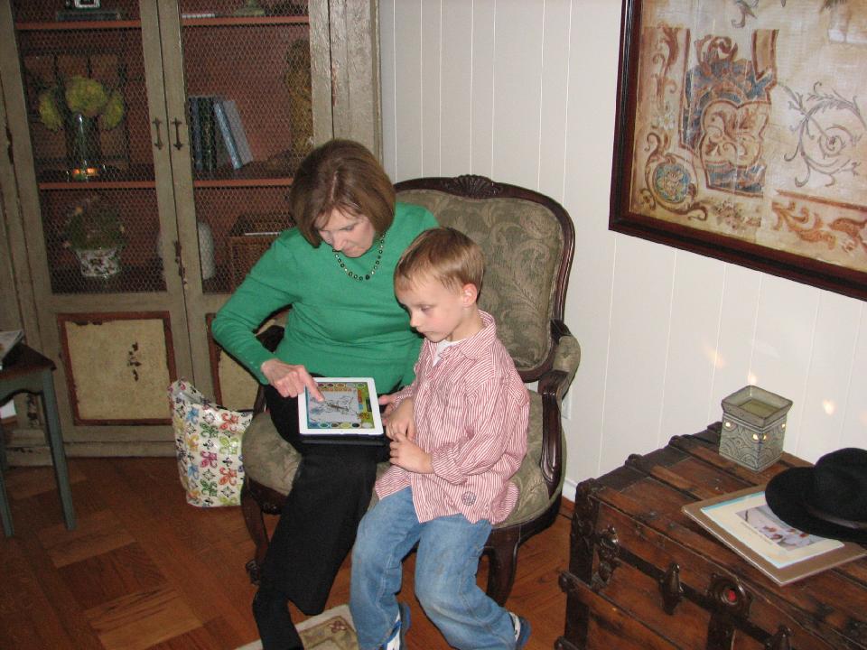 Peggy with Caden Clingan playing games on the iPad