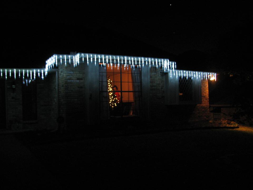 Icicles on the outside; Peggy decorating the tree inside.