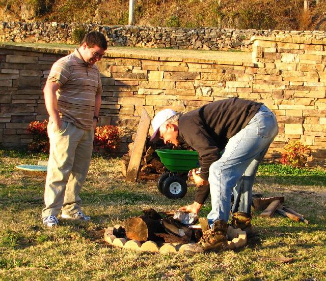 Some levity while preparing the fireplace.