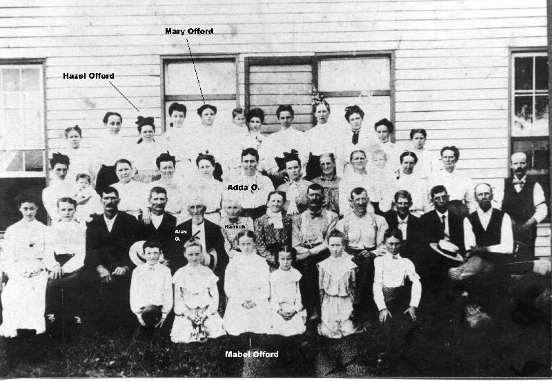 1905 photo of those who lived near Alexander and Hannah Offord in Morgan Twp, Morgan Co, Ohio. Key family members are noted. This was taken prior to the death of Hazel in the same year - maybe even the same month. Since Alex and Hannah are by far the eldest present and in the middle of the photo, this was likely a special celebration for them. This could have a 55th wedding anniversary for Alex and Hannah. By the absence of Frank Offord, we assume he was behind the camera. The Devol cousins were in attendance. Cousin Dessie Devol is 2nd from left on 2nd row. Ida Offord Devol is woman on the right in 3rd row. Bernard Devol is young man 3rd from right in 2nd row.