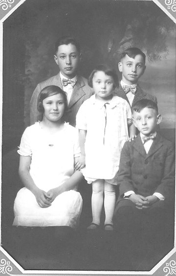 Family portrait of the Broedels. Margaret, who later married Frank Dugan, is on the left. Next are Eleanor and Ralph (who was a Navy pilot and was kiiled in WW II). In the back row is Elmer and Howard. All have now passed on.