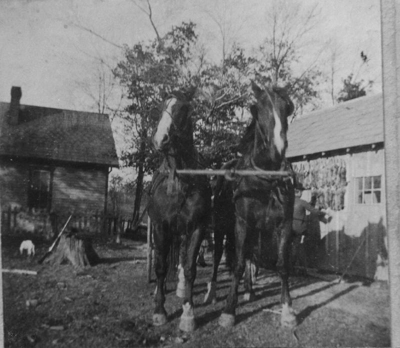 Scene at the Frank Offord place after a rabbit hunt (note man in background is skinning rabbits on the side of the old shop.) This shop was later pulled to the big house and subsequent generations skinned rabbits on it into the 1970's. This photo was probably taken between 1900 - 1910.