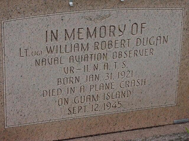 Memorial to Bill Dugan on the reverse side of the headstone of Mabel and Darl Dugan gravesite in McConnelsville Cemetery.