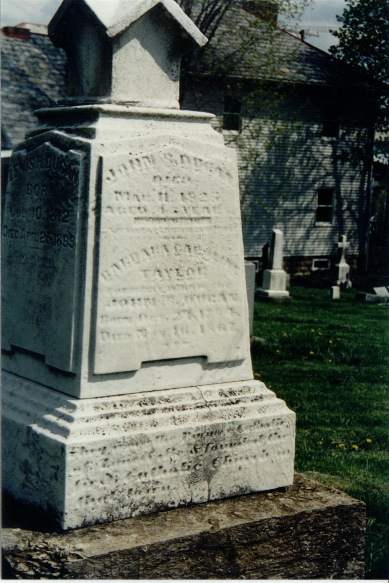 Marker to John Smon Dugan at St Thomas Cem in Zanesville. His remains are actually buried below the church floor downtown. Also a marker for his wife Barbara Caroline Schweitzer who went on to marry Gen. James Taylor after Johns untimely death. Taylor built the Mound House in Duncan Falls, OH. The LDS church says Barbara died and is buried in NY state (Herkimer). Don't know who is correct. John operated the Green Tree tavern in Zanesville until he was killed in a stagecoach accident in 1824 while bringing the first Catholic priest to Zanesville. He operated the tavern/hotel with his brother Peter who is the ancestor for MD Dugan and the other Dugans in this website. The lineage is Peter Dugan, Richard Henry Dugan, Charles Dugan and then Meredith Darlington Dugan.