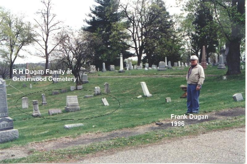 An 80-year old Frank Dugan standing in from of the graves for Richard H Dugan family members, They were buried in 5-grave lot purchased at the time of death of dau-in-law Luanna Bird Dugan (leftmost marker). Next is Ella Josephine Dugan Clark Still (dau), Wm T. Morton (son-in-law from Oakland, CA who died unexpectedly while visiting in Zanesville), probably Ellen C. Faust Dugan (wife), and Richard's civil war military marker. We're not sure Ellen is in this grave because someone did not fill in the cemetery books completely for her record, but Anna Roberts took care of the arrangements as she did for others, so we assume this is where she was planted.
