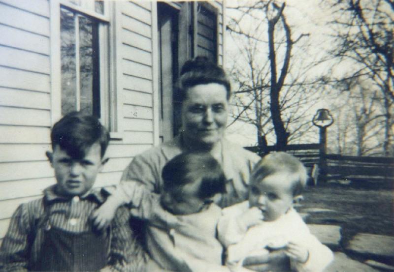 Adda Smith Offord with 3 of her grandsons: Don McCormick, Frank Dugan, Wayne Dugan. About 1919. In front of the "big house" at the farm.