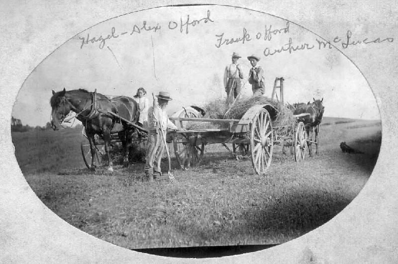 Photo possibly from 1905, or slightly older, showing the Offord family at work in the hay field. That is Hazel on the buck rake. Alexander with the beard on the ground. Frank Offord (l.) and Arthur MacLucas (r.) on the wagon. Arthur was married to Emma, the youngest daughter of Alexander and Hannah. Handwriting on this photo is Mary Offord McCormick. This photo was widely circulated among the family probably because it showl Hazel raking the hay. One day after completing this chore, she was struck by lightning while letting the horse through the gate into the pasture and killed. The gate was by a large sycamore tree, which still stands.