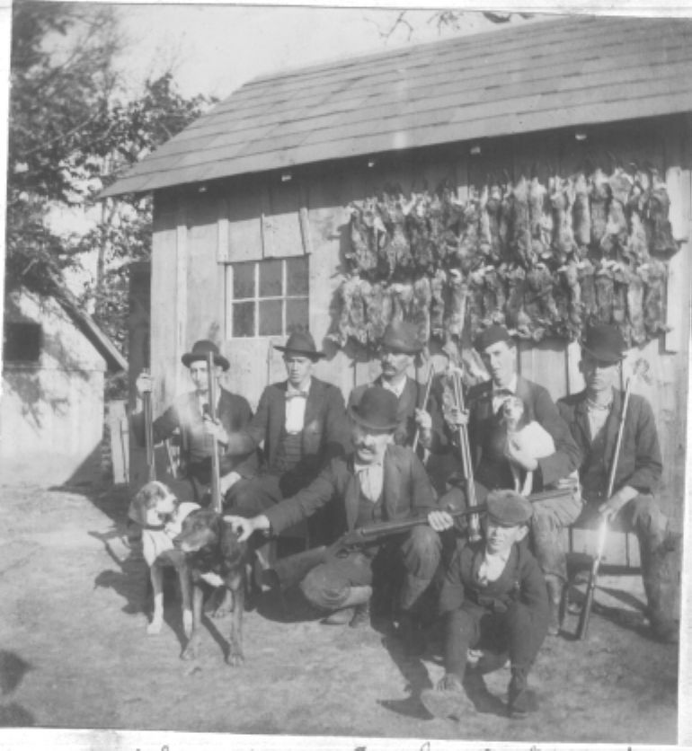About 1900-1905. The Offord clan from Zanesville and Columbus descended on the farm in McConnelsville occasionally for a hunt. Seated against the shed are Johnny, Bert, Frank, Henry, and unknown. In the front is George Palmer who was married to Cornelia "Nealy" Offord, and Chester Richardson. Johnny, Bert, and Henry were sons of John Carney Offord, Alexander's brother. Cornelia was their sister. As you can see, hunts in those days could be quite productive. Of course, besides the dogs, they would use ferrets to go into the holes and force the rabbits out. This hunts continued until the 1930's. Frank Dugan recalls it sounding like a war when they would get the rabbits moving. In his later days, Frank Offord would hunt from the buggy and was reported to have shot a rabbit underneath the horses.