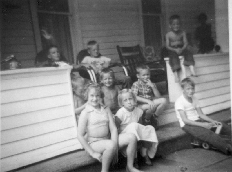 Dugan-Long bunch on the porch at the MD Dugan house about 1957 or 1958. Karen and Cheryl in front. Jim to the right. Next row appears to be Tom, Larry, and Roger. Craig is on the rail. The big guys in the chairs are Bob and John. Not sure where Dan was.