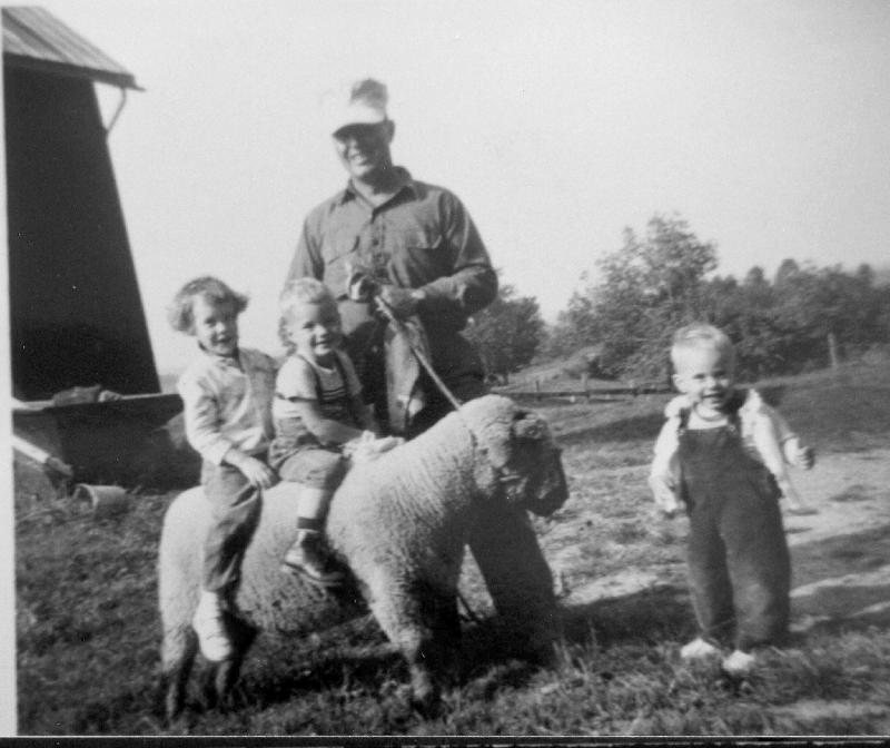 Riding the ram in 1952. Karen and Jim on the ram with the reins held by Frank Dugan. Roger on the ground observiing.