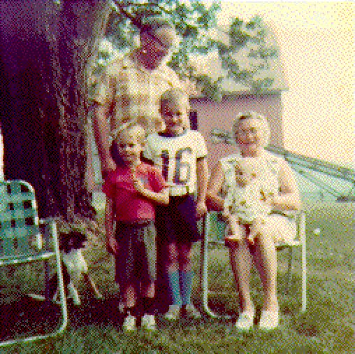 Frank and Margaret Dugan with grandchildren Steve and Jim Kinney, Kathy Dugan on Margaret's lap. Summer 1974.