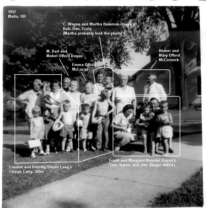 1952 Group photo at MD Dugan home in Malta. Cheryl Long, John Long, Bob Dugan, Dan Dugan adjusting belt, Margaret Dugan holding Tom, Frank Dugan holding Karen and Jim. 2nd row: Landon Long, Dorothy Long holding Larry, Mabel Offord Dugan, Emma Offord McLucas (youngest child of Alexander and Hannah), Mary Offord McCormick, Homer McCormick. Back Row: MD Dugan behind Mabel, Wayne Dugan holding Craig. Roger Dugan was hiding because Aunt Emmie was there and was a known "cheek pincher". Martha Dugan was likely the photographer since she was missing from the photo.