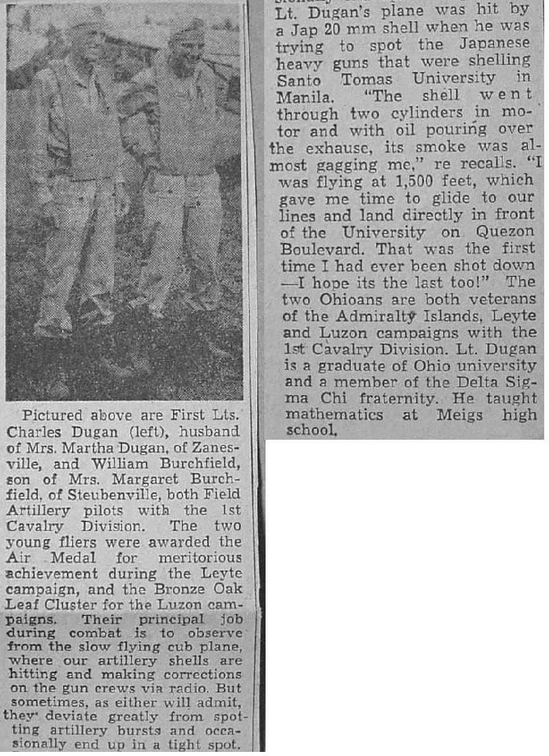 Larger news clipping about Wayne Dugan's exploits over Manila with photo of Wayne and William Burchfield.