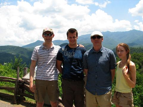 Andrew, Peter, Paul (a.k.a., "the apostles"), and Ellen at the overlook at Gatlinburg. Mt. Le Conte in the background (Highest peak in the Smokies)