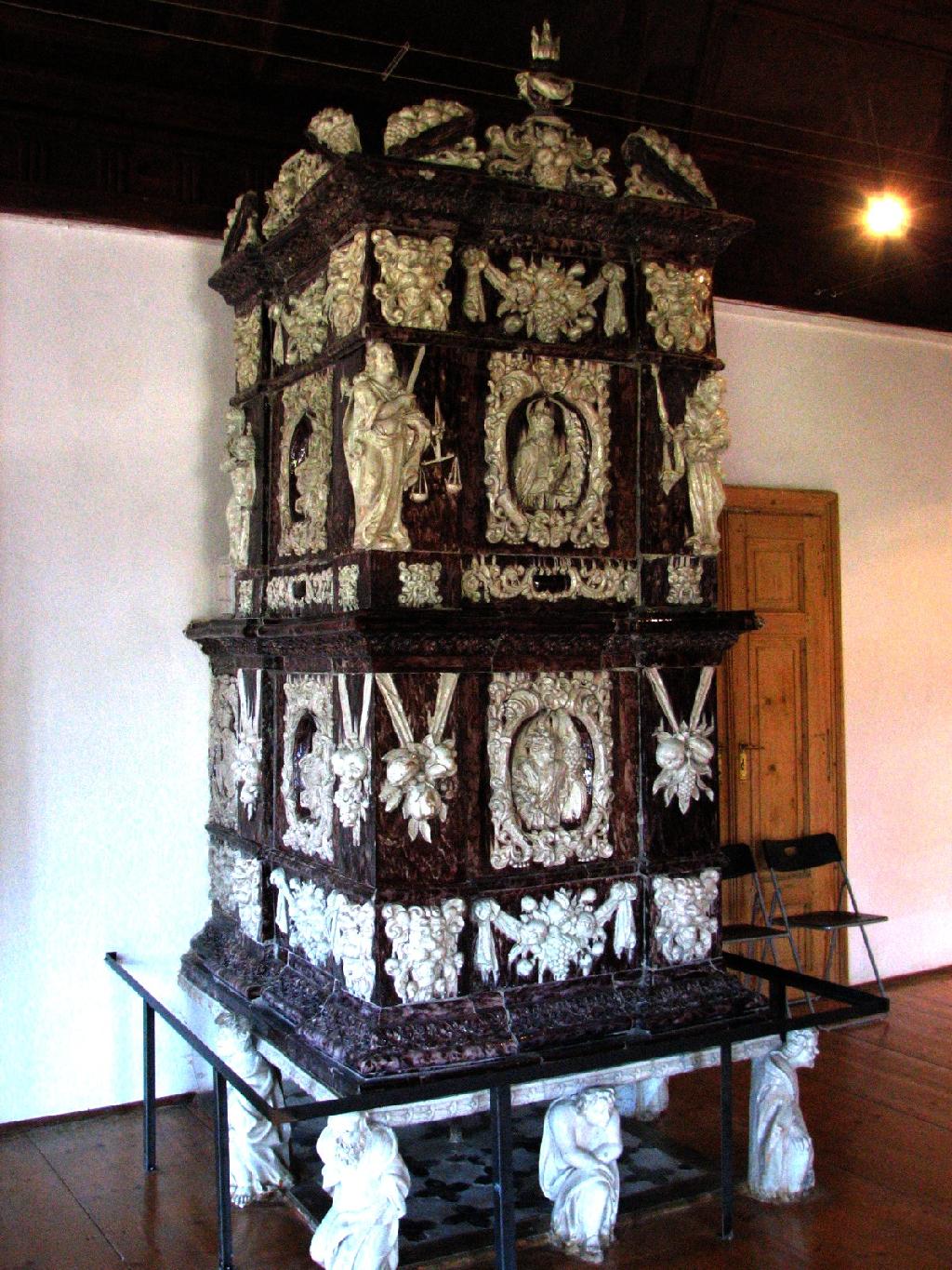 One of many ornate room heaters. Fire was fed from room to the back. Chimney in wall