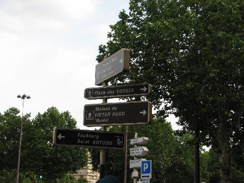 Street signs; they just give the general direction. At rush hour, it is gridlock. Take the metro.