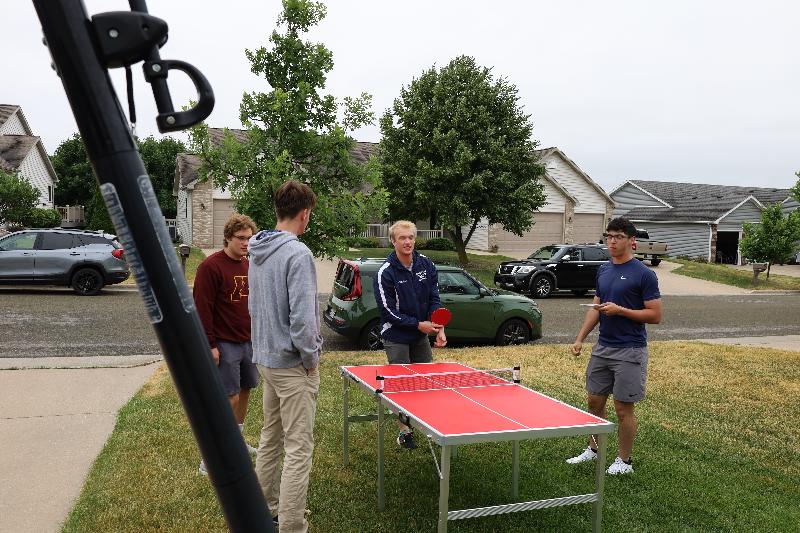 Front yard ping pong. Too chilly for shorts and T-shirt! Tough kid!