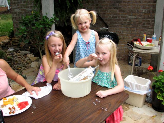 Licking the paddle. Yum, yum. (The Arritt girls). This'll make a memory. Sorry, Bob, if you have to buy an ice cream freezer because of this.
