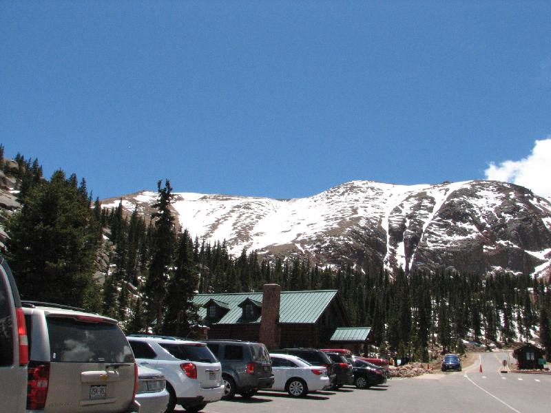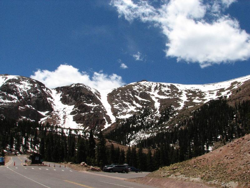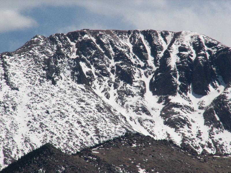 Looking up at Pikes Peak from the treeline. Winds were too high to go farther. Yes, those are ski slopes.
