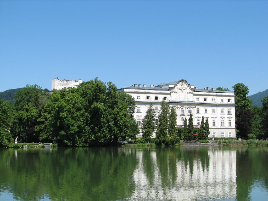This house built for an Archbishop was used as the model for the back of the house in the Sound of Music. Salzburg fortress in the background. This view of the house is never shown in the movie. Another nearby house was used (it was a different color). A replica of the gates on the lake was made at another place on the lake. This is where the scenes looking out onto the lake were shot. Nevertheless, many people recognize this as the "Sound of Music" house -- possibly, due to publicity photos.