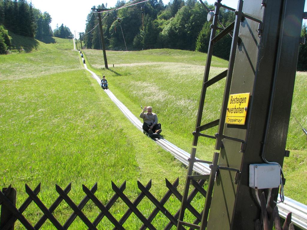 Roger heading up the mountain to take a quick ride down the stainless steel track. Forgot to take the second ride.