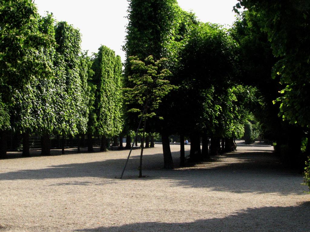 Trees in a row and trimmed vertical on at least one side.
