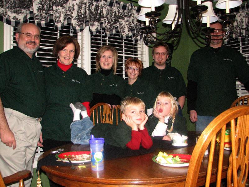 Family portrait prior to Xmas Eve meal. The shirts say "Peggy Sue's Diner" except the little ones -- their's say "Nana's Diner"