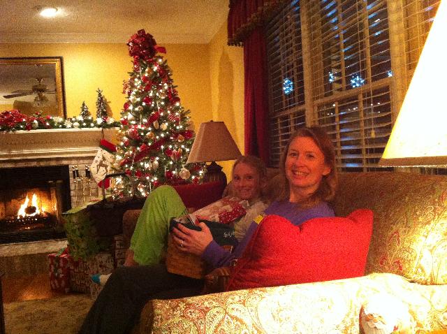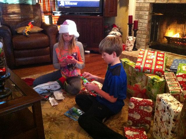 Sam and Peyton opening stockings Christmas Eve after arriving in Knoxville