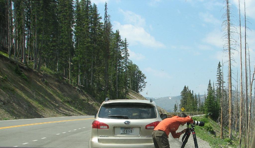 If someone was stopped it was for elk, bison, or other wildlife. Or in this case, to take photos of the burned out regions. Note that the trees on the other side of the road were unaffected.